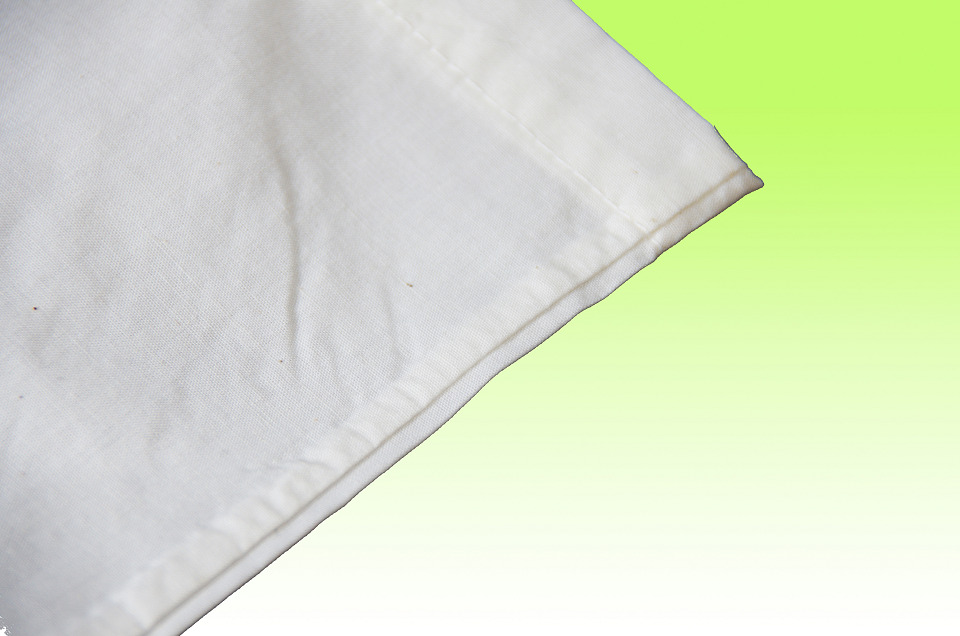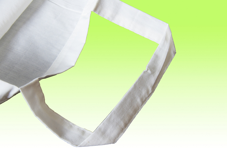 コットンバッグは、持ち手部分も機械で全自動で取り付けられます。そのため本体と同じ原反を用いて折り曲げ加工と縫製をした平らな紐状の持ち手が一般的です。