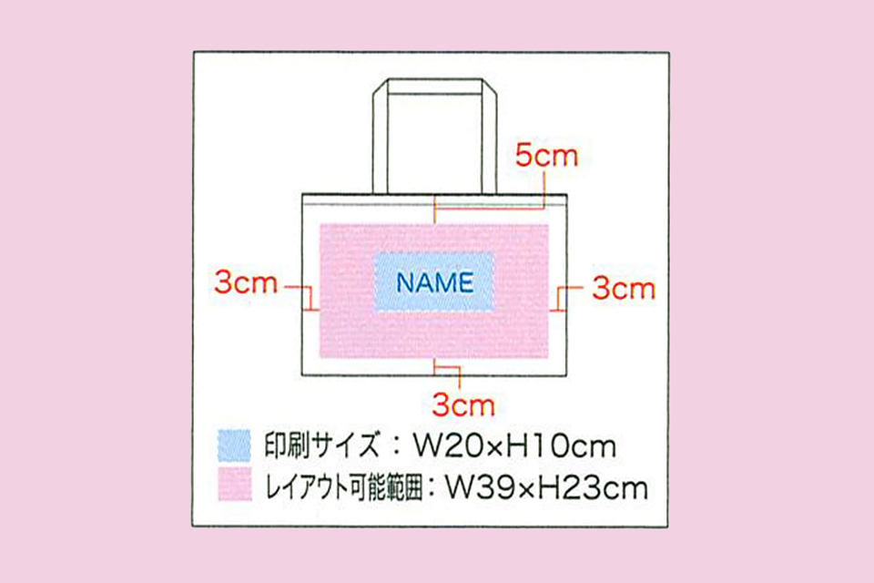 印刷可能範囲不織布バッグの印刷は上下左右に数センチの余裕が必要で、その部分を引いた面積に印刷が可能です。 |