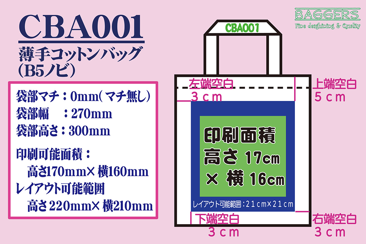 | 2 | CBA002 | 0mm(マチ無) | 310mm | 355mm | 3オンス | 生成り/紺/黒/TC白 | 200枚 |