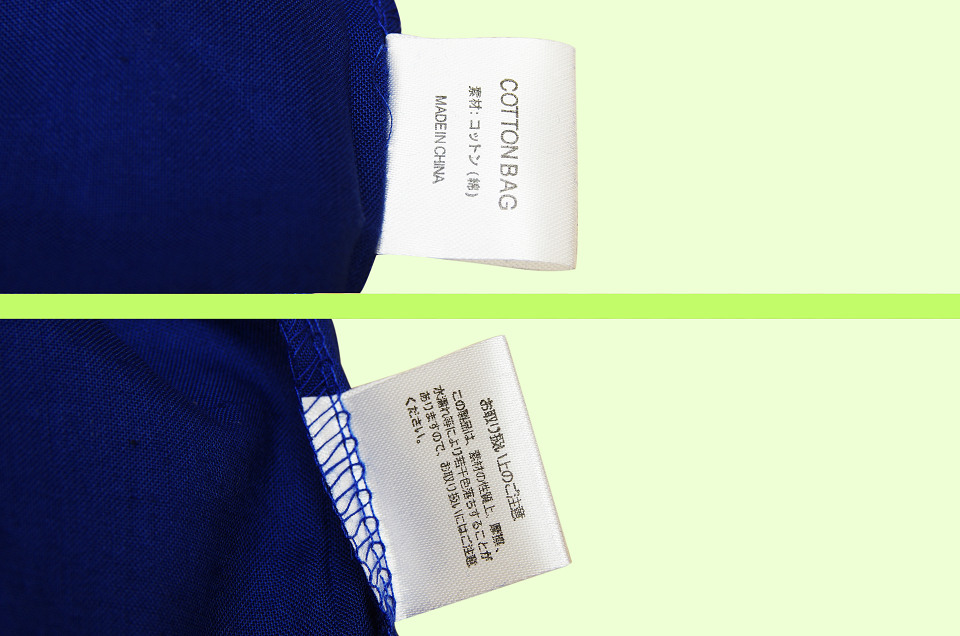 製品タグ製品の取り扱い注意点、生産国、生地種類などが記載されています。 |