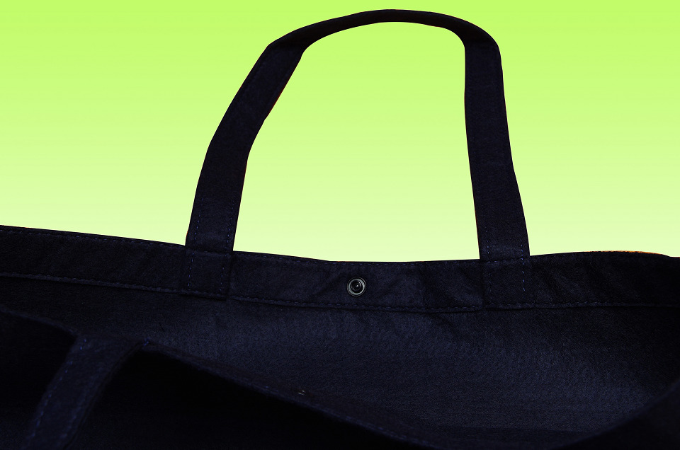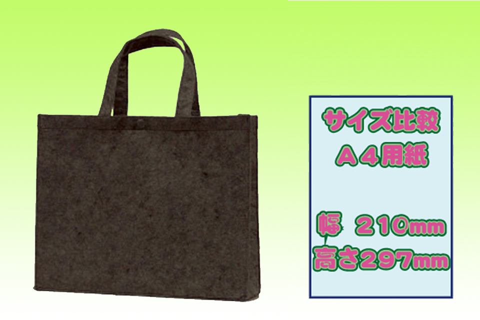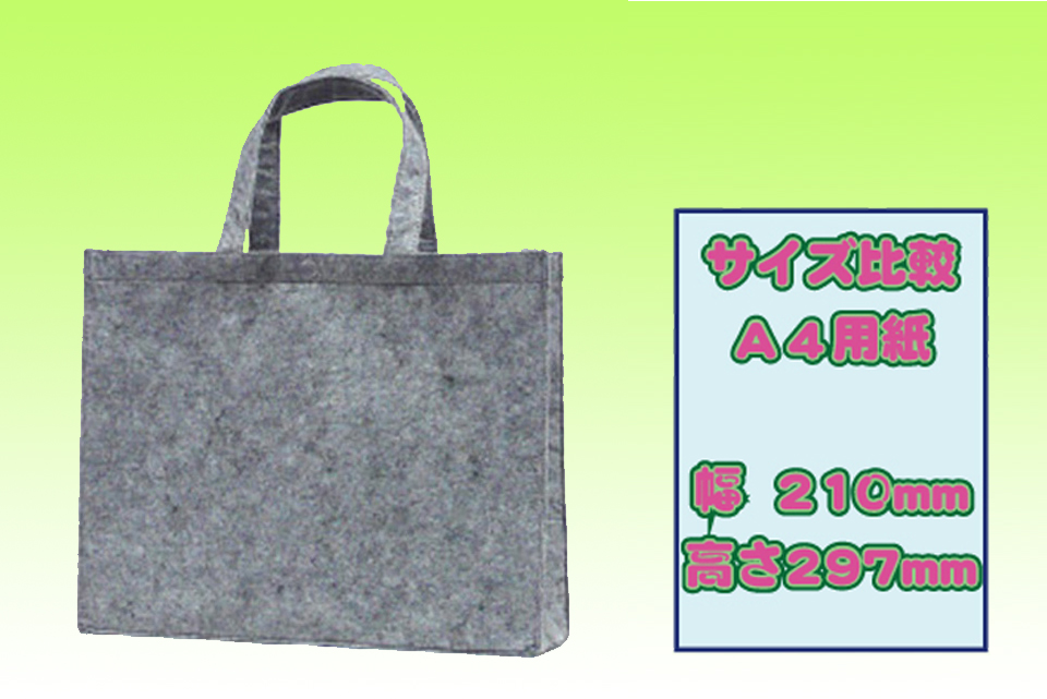 原反となるフェルトを縫い合わせ製造するフェルトバッグは、基本的な形状は底マチ付き手提げ袋型・トートバッグ型・レジ袋型などであり、ショッピングバッグやエコバッグとして小売店の店頭で販売されたり、アパレルなどの商品販売時の配布バッグとして使用されています。